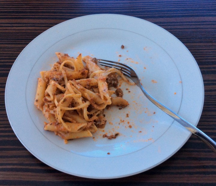 Dear Husband and all the kids loved the Bolognaise bake. It was a combination of 2 different batches of leftover Bolognaise and then some mac and cheese sauce, stirred through whatever pasta (long and short) was in the pantry. Heat up each component, cook your pasta, stir it all together and bake it for 15 minutes in a hot oven
