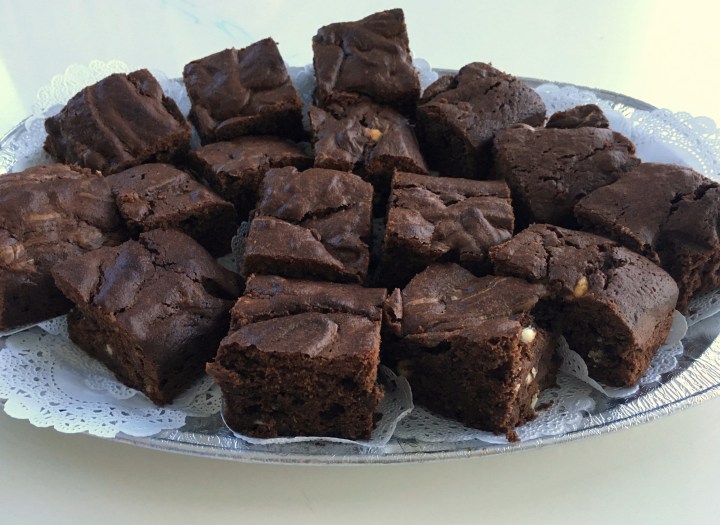 It’s sometimes difficult to find a brownie recipe that works every time and allows you to vary it with raspberries, or chocolate chips, or nuts. Four batches were required in the space of three days (thanks to school bake sales, end of term class parties and Dear Husband) and this recipe worked every time. The recipe below has half the sugar of the original recipes I saw, and uses raw cacao. For school I did not use any walnuts, but the batch for Dear Husband had the works- dark and white chocolate chips and walnuts. These brownies take little time to make and are a hit. If you like them sweeter add more sugar or use cocoa instead of cacao.
